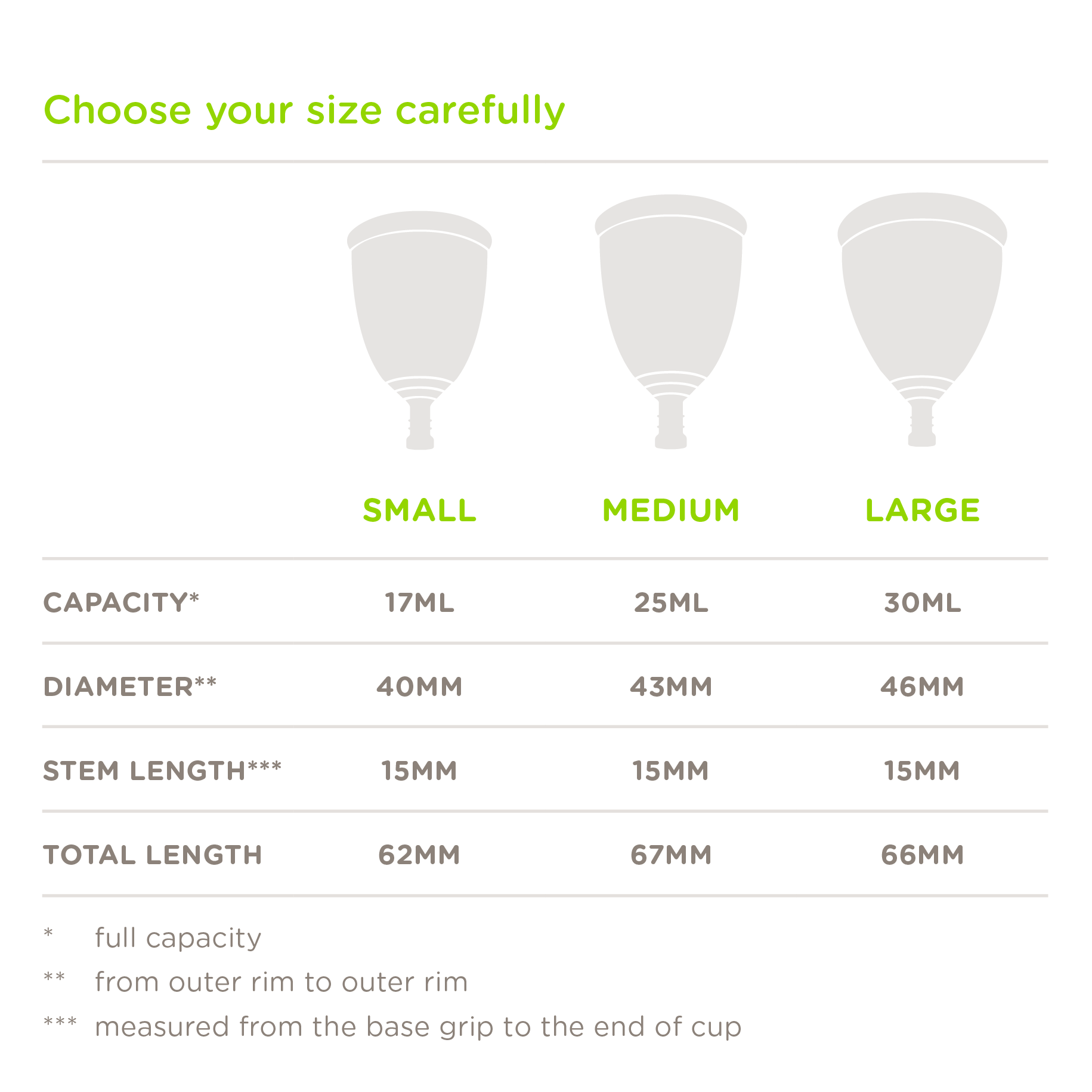 The Oi Cup™ is available in three sizes to suit different people and their flow. The following is a guideline, but it may take time to work out what size fits best for your unique shape.
